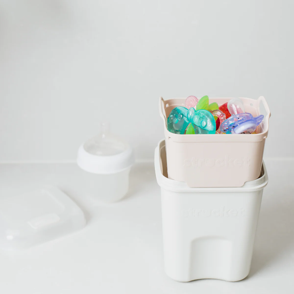 To make sure your baby isn’t chewing on a dirty teething ring or sucking a grimmy bottle, give all your baby's goodies a thorough soak in your Strucket. Just soak, agitate and lift the strainer out to let dry.