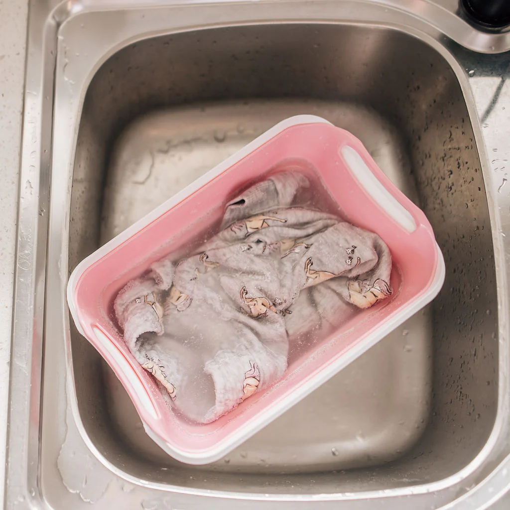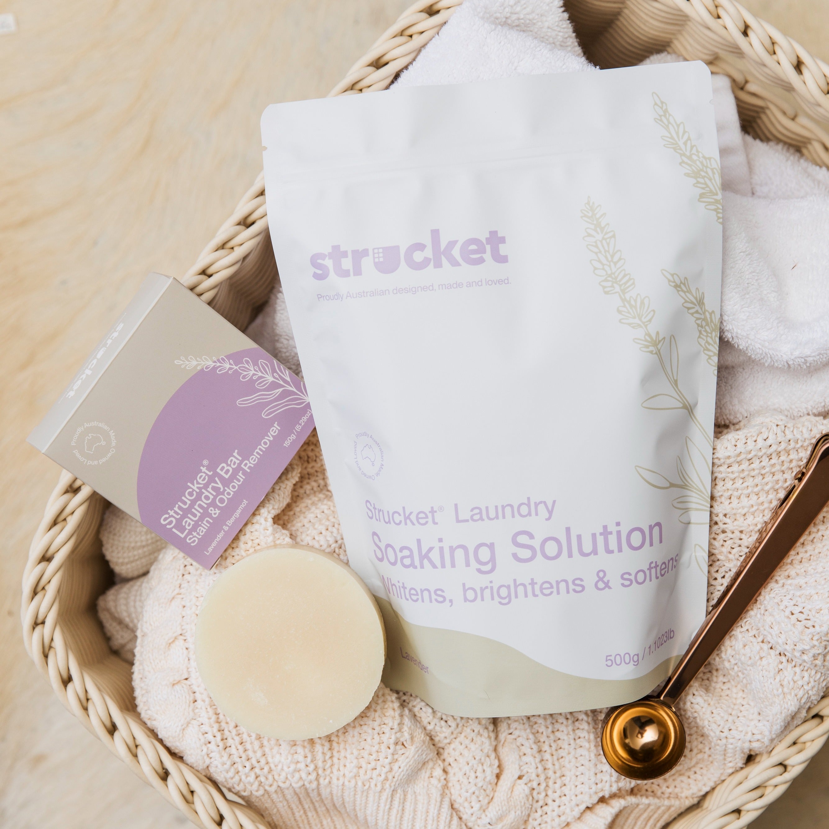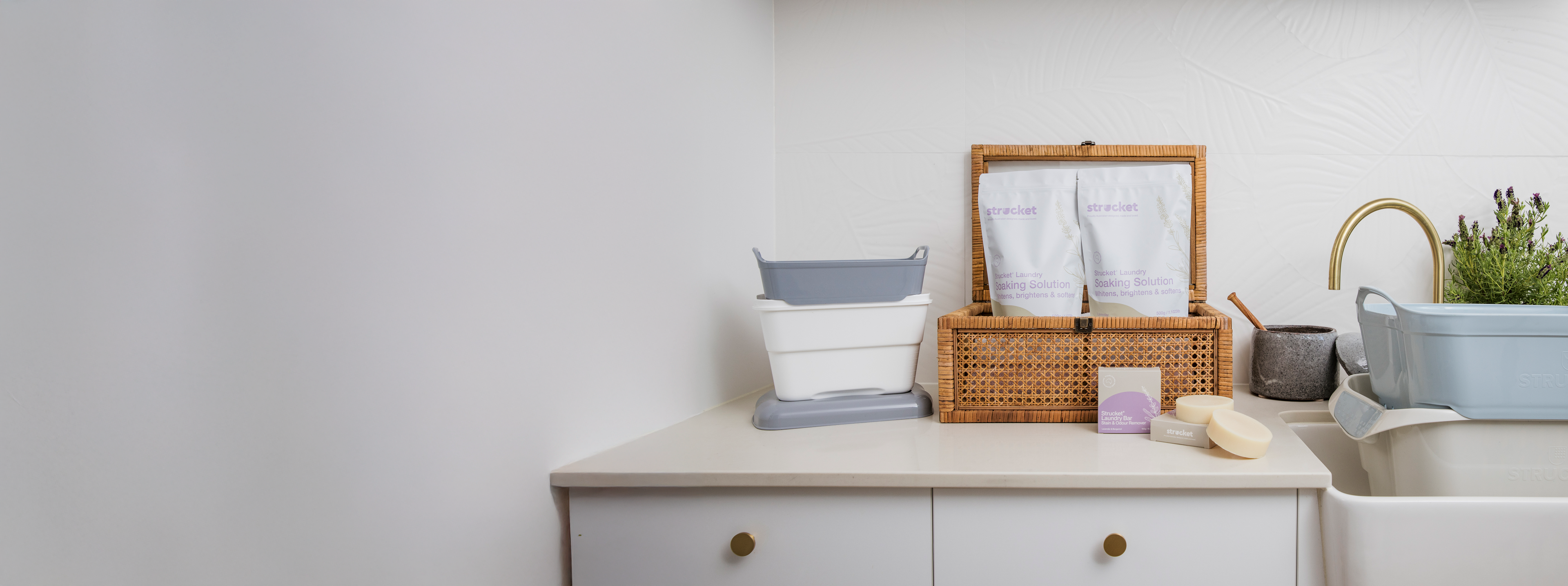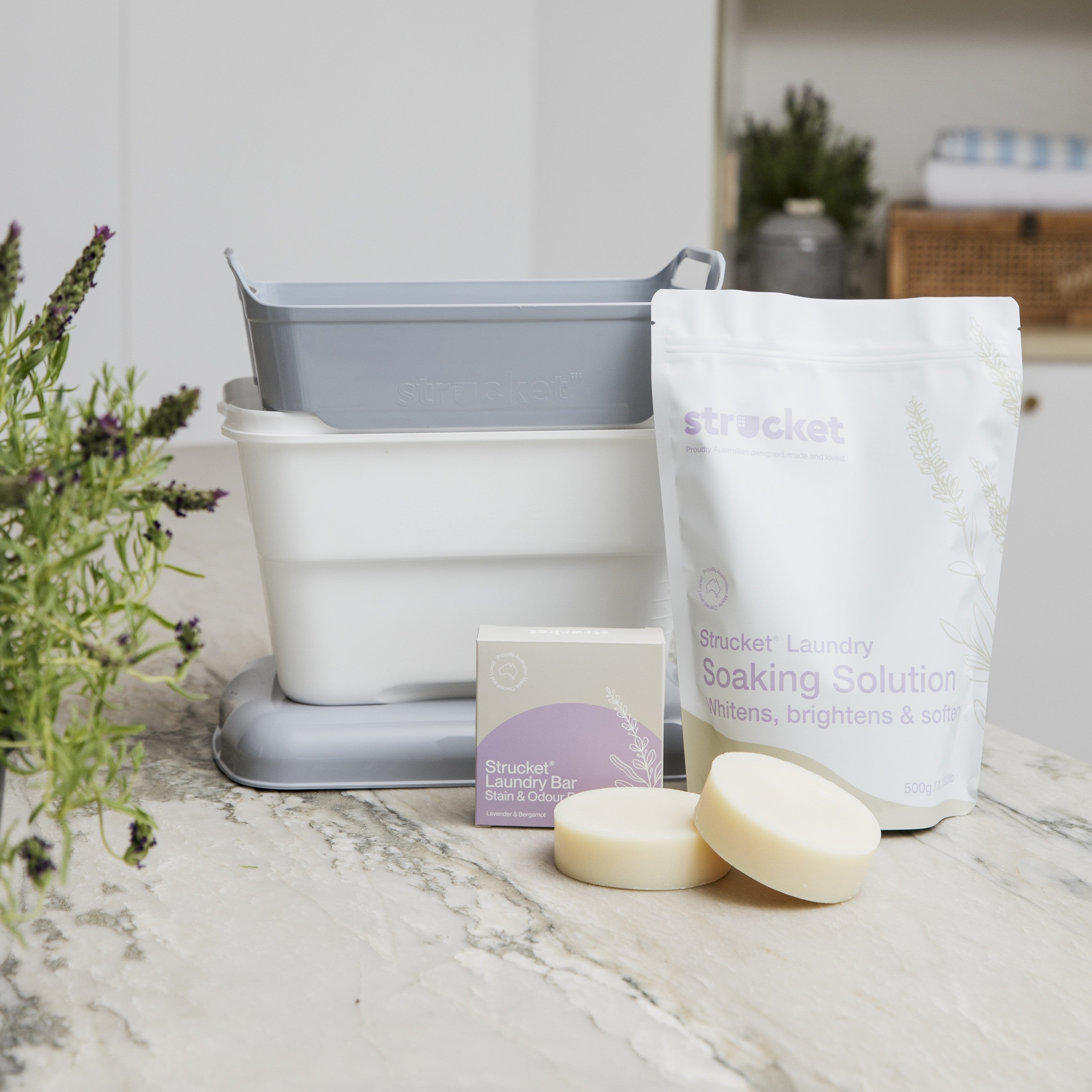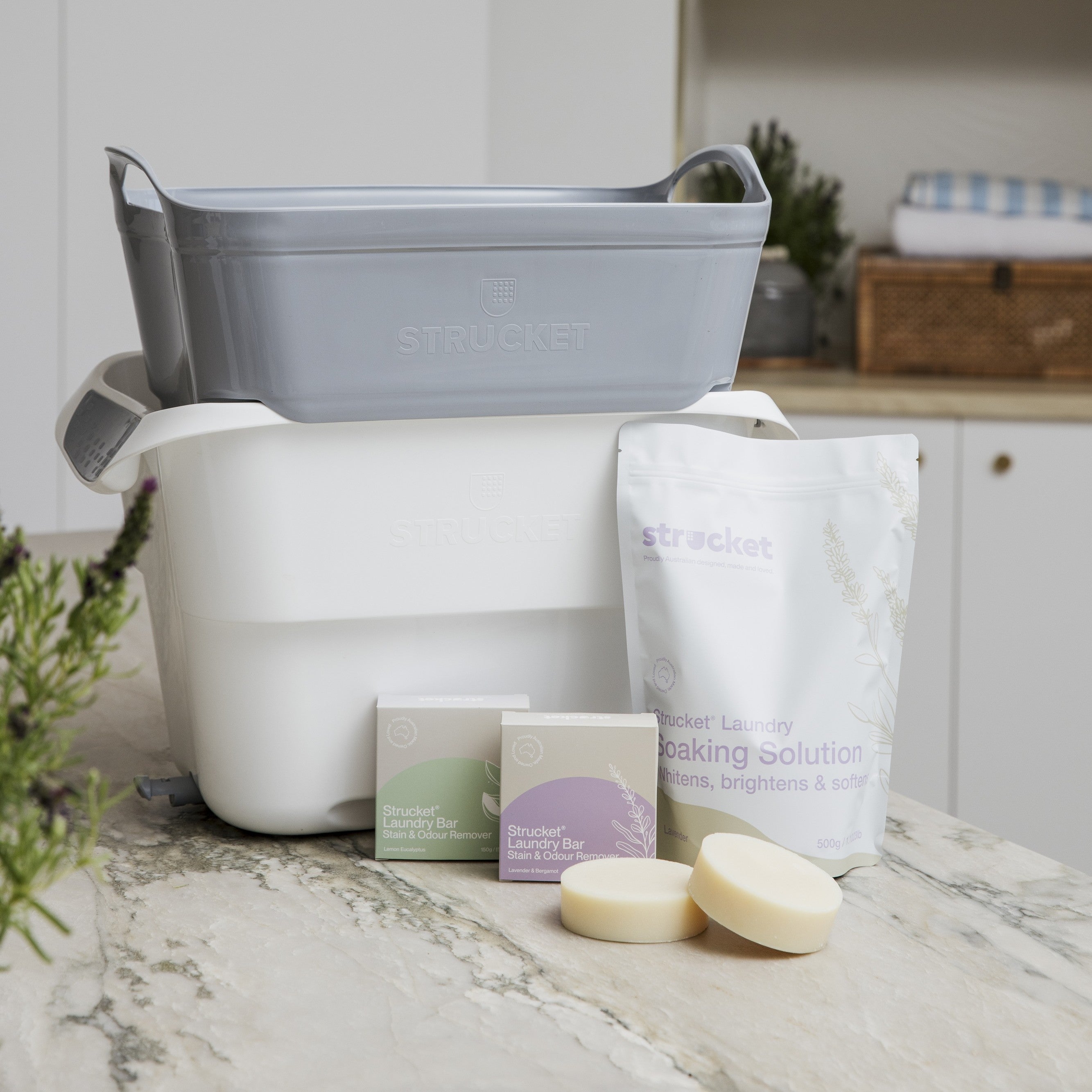 Use your Strucket strainer to transport soaked items to and from the washing machine. It saves time and means I never have to touch the residual dirty water after soaking. Plus, you can leave it by the washing machine and use it to take them out to the line!